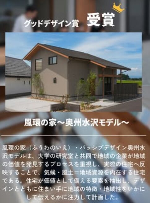 風環の家(ふうわのいえ)・パッシブデザイン奥州水沢モデルは、大学の研究室と共同で地域の企業が地域の価値を発見するプロセスを重視し、実際の住宅へ反映することで、気候・風土=地域資源を内在する住宅。住宅が価値として備える要素を抽出し、デザインとともに住まい手に地域の特徴・地域性をいかにして伝えるかに注力して計画しました。